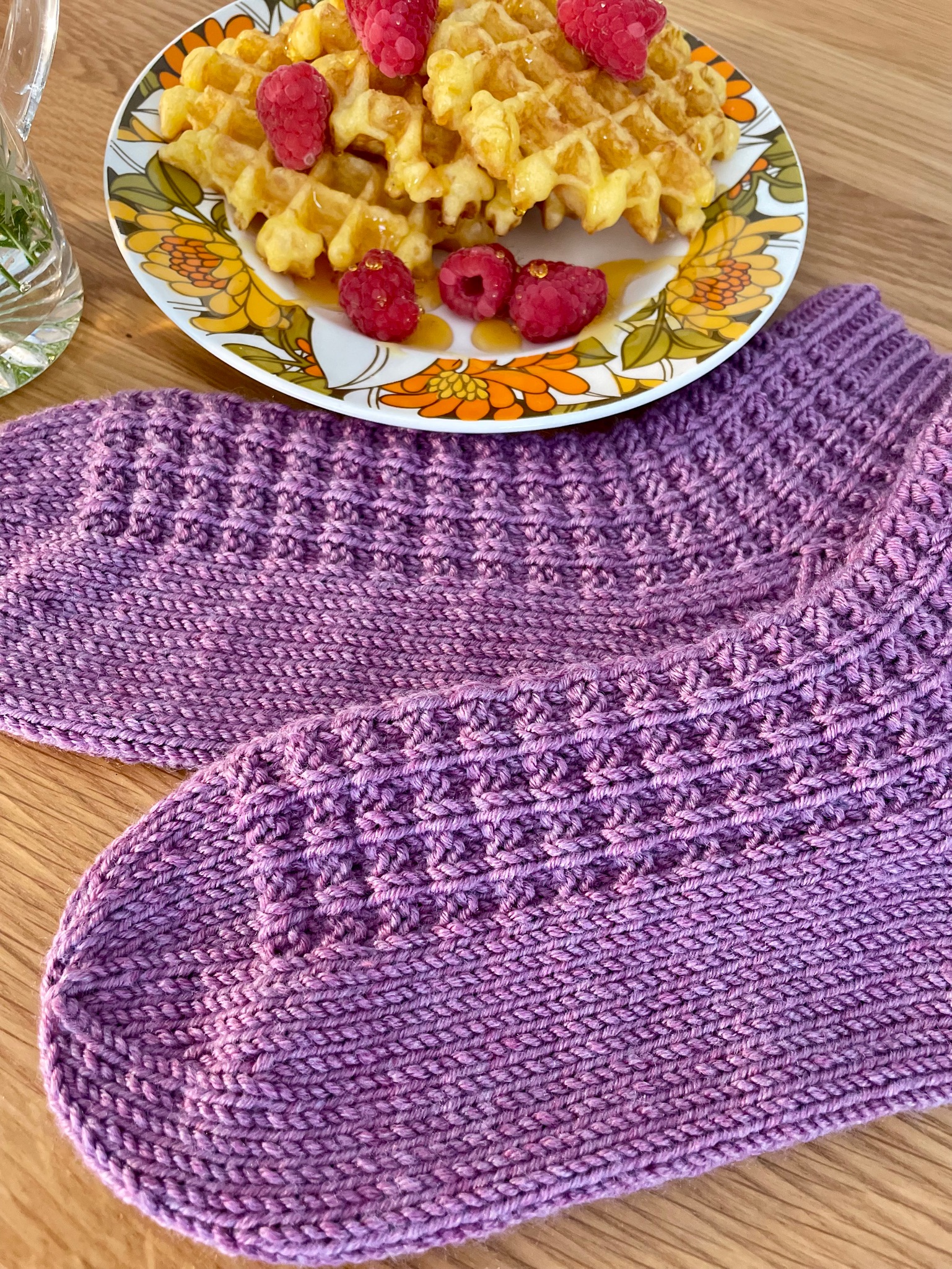 The ‘Waffle Socks’ are the fourth pattern in our Platinum Collection for 2024. They feature DK weight yarn so they knit up in a flash. They are inspired by our waffle from our ‘Video Show’